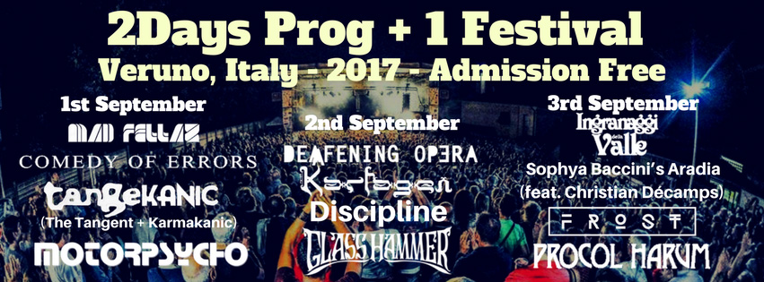 2DAYS PROG +1 is now considered the most important international festival on the Italian level and one of the most important worldwide for progressive rock music, this year at the 9th edition, and will be divided into three canonical concerts, four Concerts every night - 14 bands. Massive, as is the duty of an international festival, the presence of ten foreign artists. The event will take place from 1 to 3 September in Veruno (NO), Piazzetta della Musica.