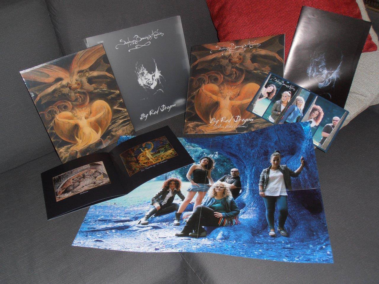THE LIMITED EDITION VINYL FOR BRD, FROM TOP LEFT: FRAMEWORK, POLYPROPYLENE BAG, DOUBLE LP RECORD WITH LYRICS AND PICTURES, CARD GROUP, BOOK WITH POSTCARDS OF PAINTINGS ON CREPE PAPER, POSTER OF THE GROUP.